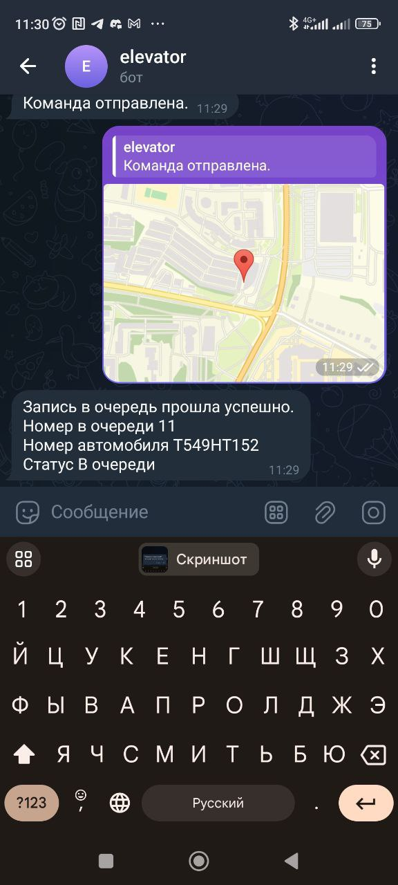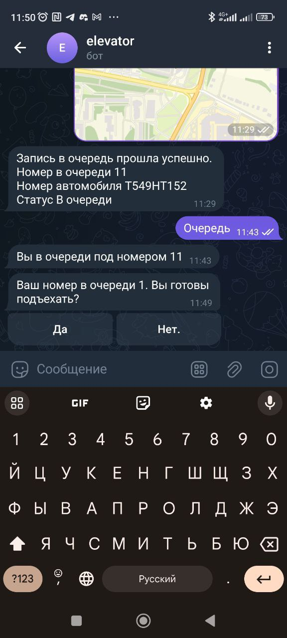 Водитель может записаться в очередь через Telegram-бот или вручную через оператора. Бот принимает геолокацию водителя и подтверждает, что автомобиль находится рядом с элеватором.